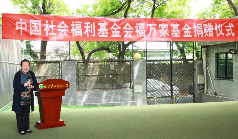 中国社会福利基金会福万家基金付秋霞秘书长向北京第二实验小学教育集团捐赠体育趣味课课练配套体育器材,芦咏莉校长代表教育集团接收。