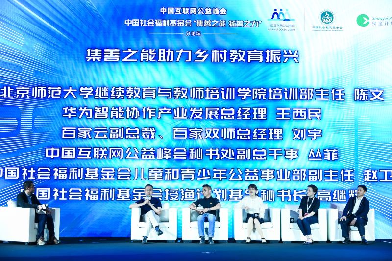 圆桌论坛环节,腾讯可持续发展事业部项目顾问、中国互联网公益峰会秘书处副总干事丛菲,北京师范大学继续教育与教师培训学院培训部主任陈文,华为智能协作产业发展总经理王西民,百家云副总裁、百家双师总经理刘宇,中国社会福利基金会儿童和青少年公益事业部主任赵卫,中国社会福利基金会授渔计划基金秘书长高继辉等从“科技+教育+公益”推动乡村教育振兴做了深入交流探讨。“授渔计划·乡村扶智”双师课堂项目融合“互联网+”等新兴技术手段,通过汇聚部委支持、行业专家、企业等社会爱心力量,让优质教育资源向乡村学校精准输入,助力乡村教育发展水平提升的模式获得在场嘉宾高度评价。