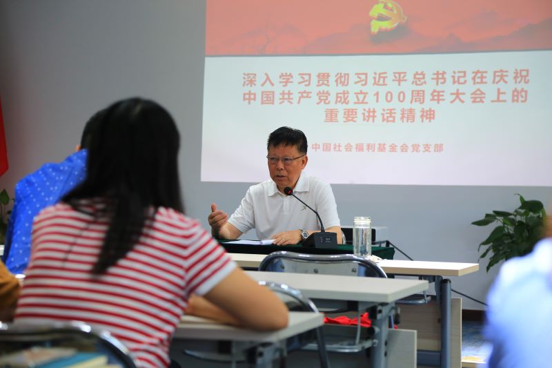 7月8日,中国社会福利基金会利用业余党校大课堂,组织全体党员、员工原原本本学习习近平总书记在庆祝中国共产党成立100周年大会上的重要讲话(以下简称“七一”重要讲话);学习习近平总书记在参观“不忘初心,牢记使命”中国共产党历史展览时的重要讲话。戚学森理事长就深入学习贯彻“七一“重要讲话,就下半年深入开展党史学习教育做出相应部署,提出工作要求。