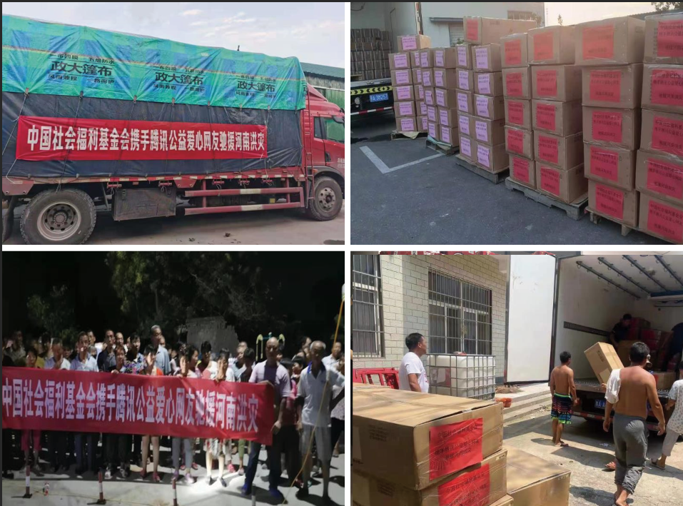 截至7月25日,由中国社会福利基金会社区发展基金发起的“紧急援河南农村”项目已向受灾严重的河南省鹤壁市石林镇和浚县卫溪街道发出8000箱纯净水、142艘皮划艇、550部对讲机、310台发电机、29000瓶消毒液、1000床被子、1500个手电筒、1350件救生衣、2150顶帐篷、12000个编织袋、1000个喷雾器、100个喷壶、100件雨衣和150把铁锹,惠及三家村、高庄村等周边50余个村庄。