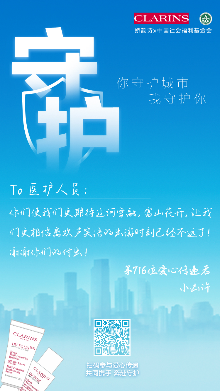 一份份爱心留言,一张张感谢海报,正随着娇韵诗的UV小白盾一起,把爱心与“守护”传递给「城市守护者」,以感恩他们为了守护城市而付出的汗水。