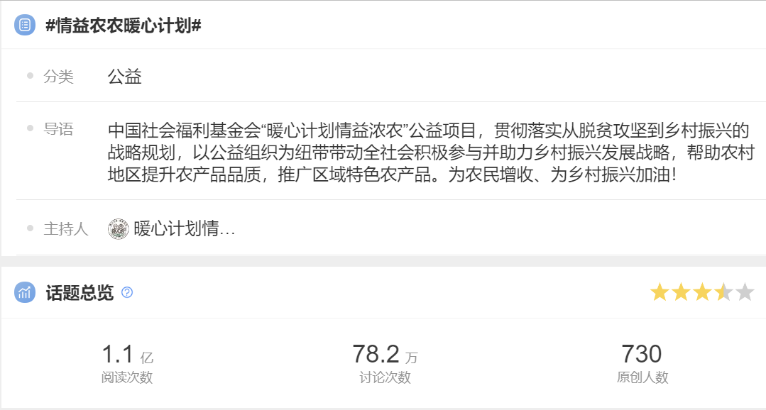 项目自2021年11月以来,已先后联合江西省莲花县、遂川县等乡村振兴重点地区开展多场主题助农公益直播活动,受到公众广泛关注,在微博平台话题阅读量已达1.1亿次。