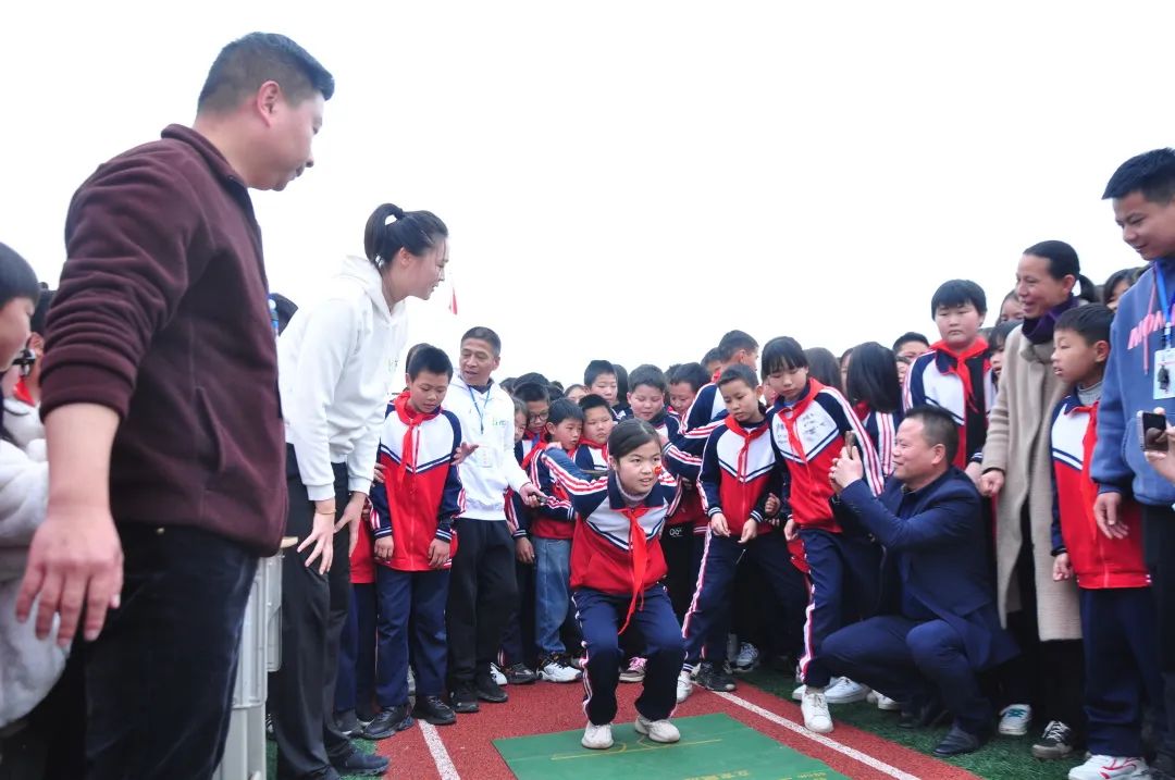 在场地的另一端,女排运动员在立定跳远的赛场,为孩子们指导和纠正动作,孩子们在老师的指导下突破自己,取得了好成绩。