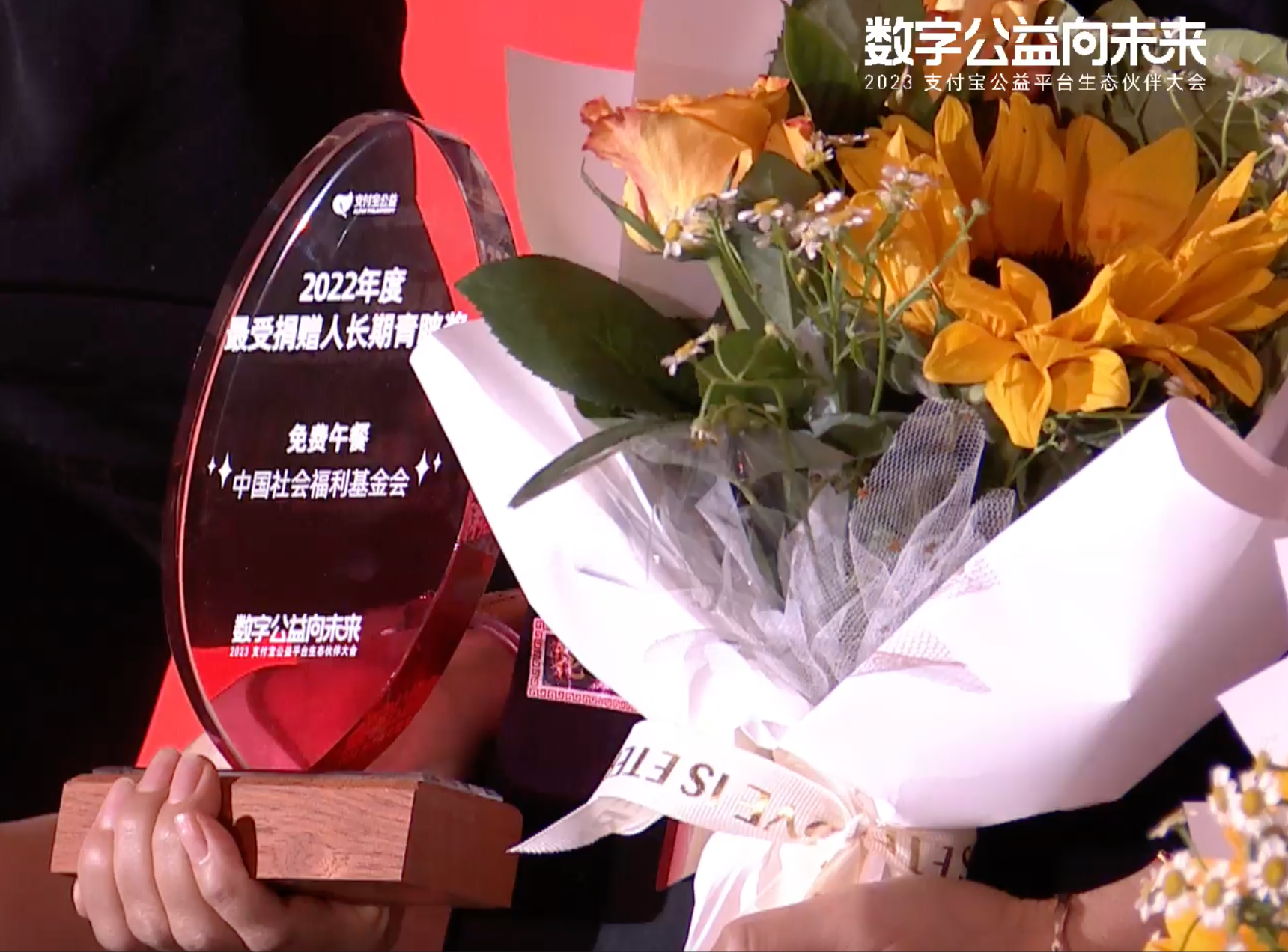 本次大会,中国社会福利基金会“免费午餐”项目获得了“2022年度最受捐赠人长期青睐奖”,免费午餐基金品牌与合作发展中心总监叶凤上台领奖发言,感谢支付宝公益平台与广大爱心网友的支持,让孩子们吃上了热腾腾的午餐,我们一定会更加努力,守护好孩子的未来,不辜负大家的信任。数字公益时代,也是人人可公益的时代,捐赠人参与公益的方式更加多样和便捷。未来我们会持续探索,做好执行和公开,守护每一位受助人,也守护来自捐赠人每一份的善意。