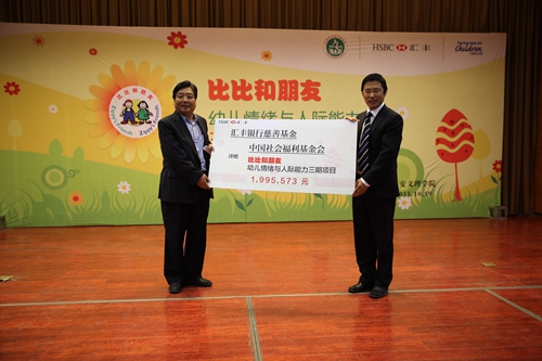 陕西省教育原副厅长吕明凯、西安文理学院校长徐可为、汇丰银行中国有限公司西安分行行长周奕丞、汇丰银行中国有限公司企业可持续发展总监张惠峰及高级经理王颖、中国社会福利基金会副理事长张仲、英国儿童好拍档总监Chris Bale先生及项目负责人Caroline Egar 女士、中国教育科学研究院研究员及项目负责人刘占兰教授及其团队,均出席了此次项目启动盛会。会上,汇丰银行张惠峰总监向中国社会福利基金会张仲副理事长颁发了捐赠支票,张仲副理事长向“比比和朋友”项目西安地区负责人下达了项目任务书。