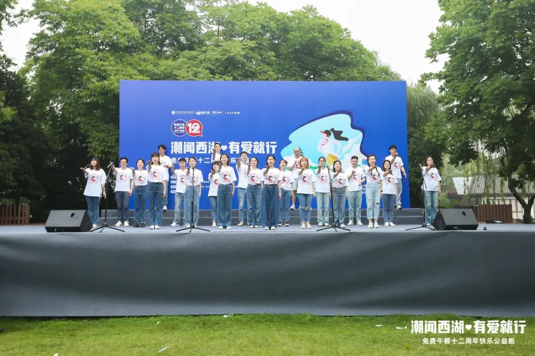 杭州青年合唱团在西子湖畔的大草坪为大家倾情演唱免费午餐项目主题曲《饭》,这也是该主题曲合唱版的首演。