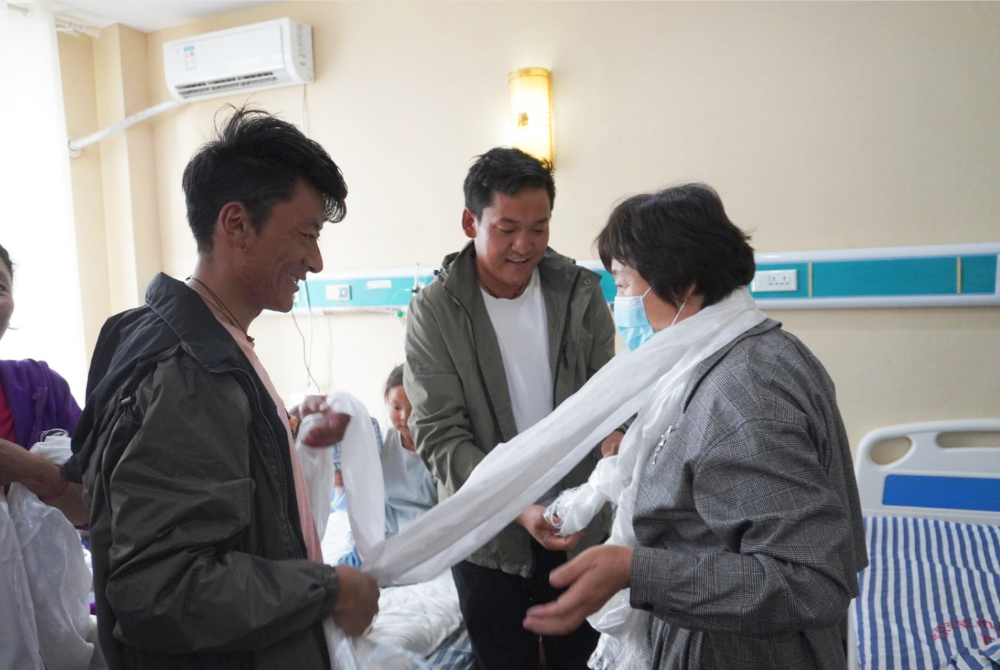 西藏患者达娃是一名肢体畸形患者,由于出生时缺氧造成脑瘫,导致双足畸形且活动受限,父母带达娃四处求医但效果甚微。2023年“站立计划——困难骨病肢残人项目”走进西藏,为当地骨病患者进行公益筛查,达娃也迎来了改变人生的一个机会。为了感谢站立计划项目,达娃的家人也给我们准备了一份欢喜,当她把象征吉祥如意的哈达献给缪瑞兰副理事长及项目工作人员时,我们也祝福孩子们健康茁壮成长。
