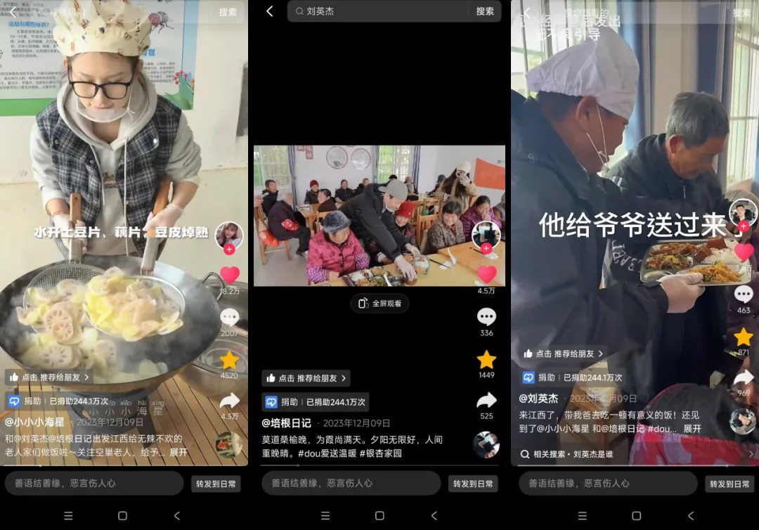 去年年底,@小小小海星 、@培根日记 、@刘英杰 三位以“吃”见长的抖音创作者,作为银杏家园志愿者,来到江西程水站点,现场为老人们烹饪营养饭菜,并前往低收入老人家庭走访,三位创作者发布的实地探访视频收获了1100多万次的播放量,让更多人看到真实存在的助老需求。