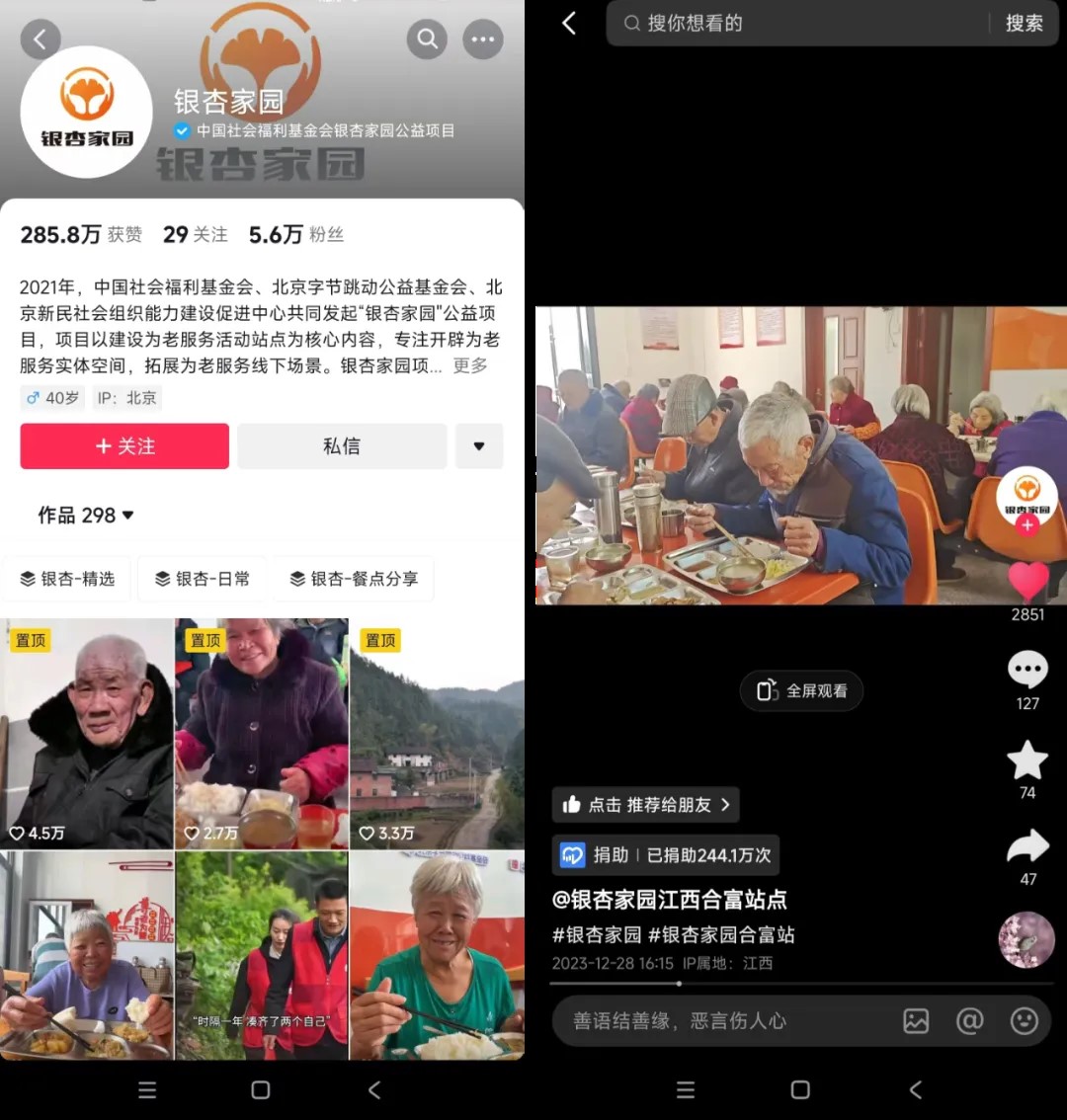 银杏家园的所有站点在启动运营时,执行机构便会注册抖音账号,定期发布站点老人生活视频,记录站点的助餐、防诈培训、医疗服务等活动,也会发布项目捐赠的重要进度。这些内容还会获得字节跳动公益平台的流量扶持和推荐,有效呼吁更多抖音用户关注助老需求,参与助老行动。