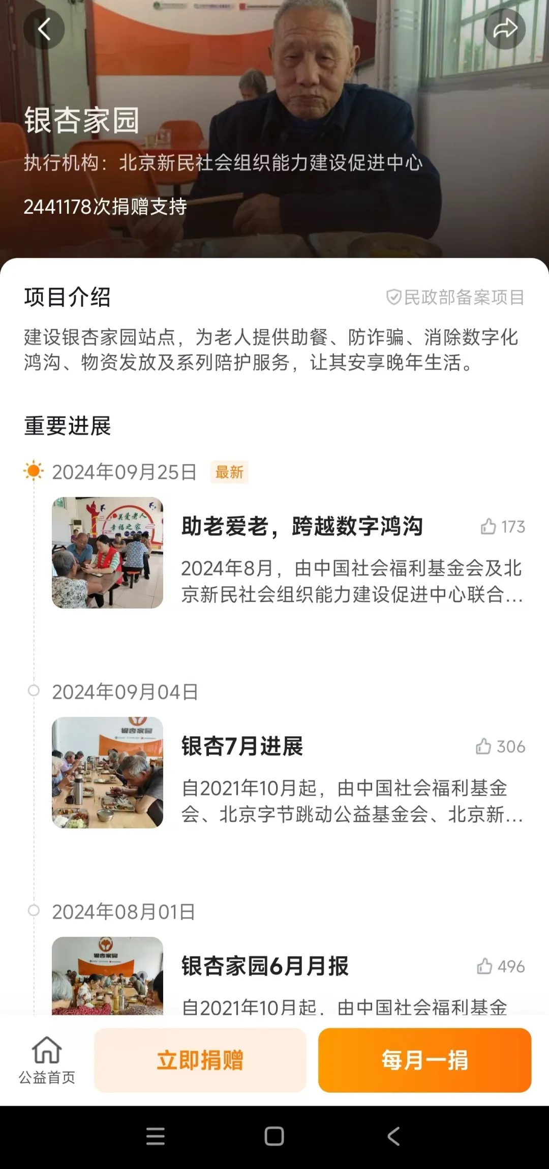 提升捐助者体验是银杏家园项目发起方始终在推进的事,字节跳动公益平台基于技术能力,设置项目反馈机制,完善产品功能,为项目提供公开募捐工具及资源。项目执行机构基于平台的反馈体系,及时向参与捐赠的用户推送项目进度详情,让捐赠人明确自己的捐款用到了什么地方,帮助了哪些人群。这些反馈机制有效提升公益捐赠体验感,助力传递社会助老公益理念,让信任持续加固。