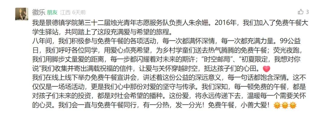 詹思珊目前已经成为免费午餐注册志愿者,和朱丹还有无数个志愿者一样,成为孩子们午餐的“守门人”,她们也成为爱心种子,影响越来越多人好奇公益,参与公益。