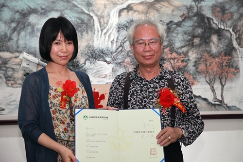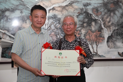 据朱老先生介绍,这次捐赠的作品由10幅书法作品和2幅绘画作品组成。中国社会福利基金会工会主席刘芳代表基金会接受捐赠,并向朱彤颁发“爱心大使”证书和捐赠证书。
