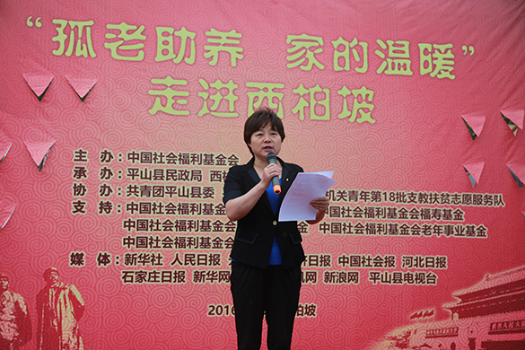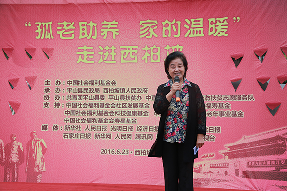2016年6月23日,“孤老助养·家的温暖”公益项目走进革命老区西柏坡,在西柏坡镇西柏坡村“两个务必”广场举行了启动仪式。石家庄市民政局、平山县委、平山县民政局等相关单位的领导,平山县阳光敬老公寓、西柏坡镇寄养家庭代表,中国社会福利基金会副理事长兼秘书长缪力、副理事长朱超英、副秘书长高月玲、副秘书长兼老龄和社区公益发展部主任缪瑞兰等出席了本次活动。