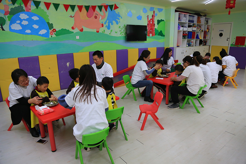 短暂的交流后,在工作人员的安排和带领下,我会工作人员变身志愿者,一对一的照顾孩子们吃中饭,体会到了患者父母和院方老师们的照料艰辛。