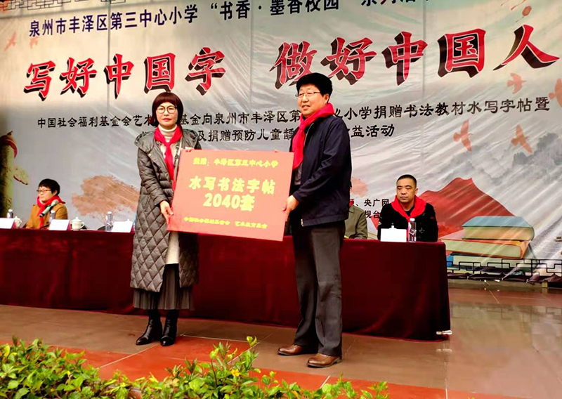 中国社会福利基金会艺术教育基金在20172019年总共捐赠给50000多名中小学生,每人一套水写书法字帖,受到了教育界、公益界、企业界、影视界的广泛关注与好评。