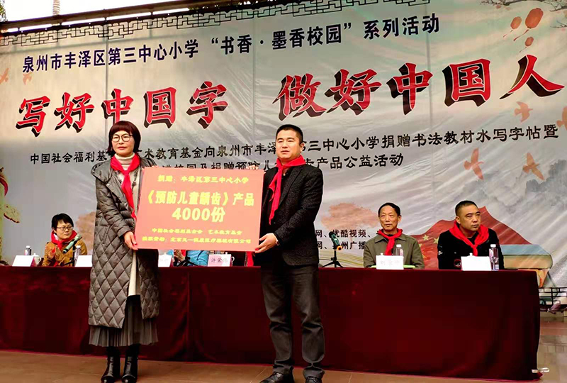2019315日,中国社会福利基金会艺术教育基金《写好中国字,做好中国人》书法进校园活动,暨预防儿童龋齿公益活动,走进了福建省泉州市丰泽区第三中心小学和丰泽区崇德实验小学。北京天一恒康医疗器械有限公司,关心民族下一代牙齿健康,给孩子们捐赠六十万人次氟化泡沫防龋齿药材。