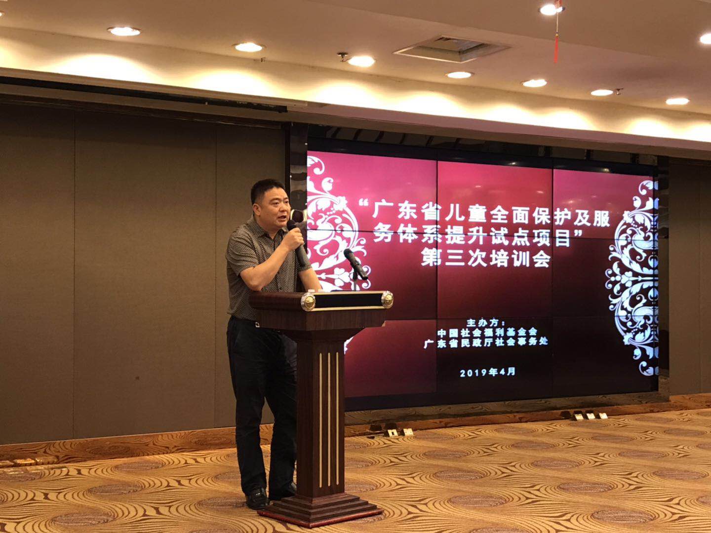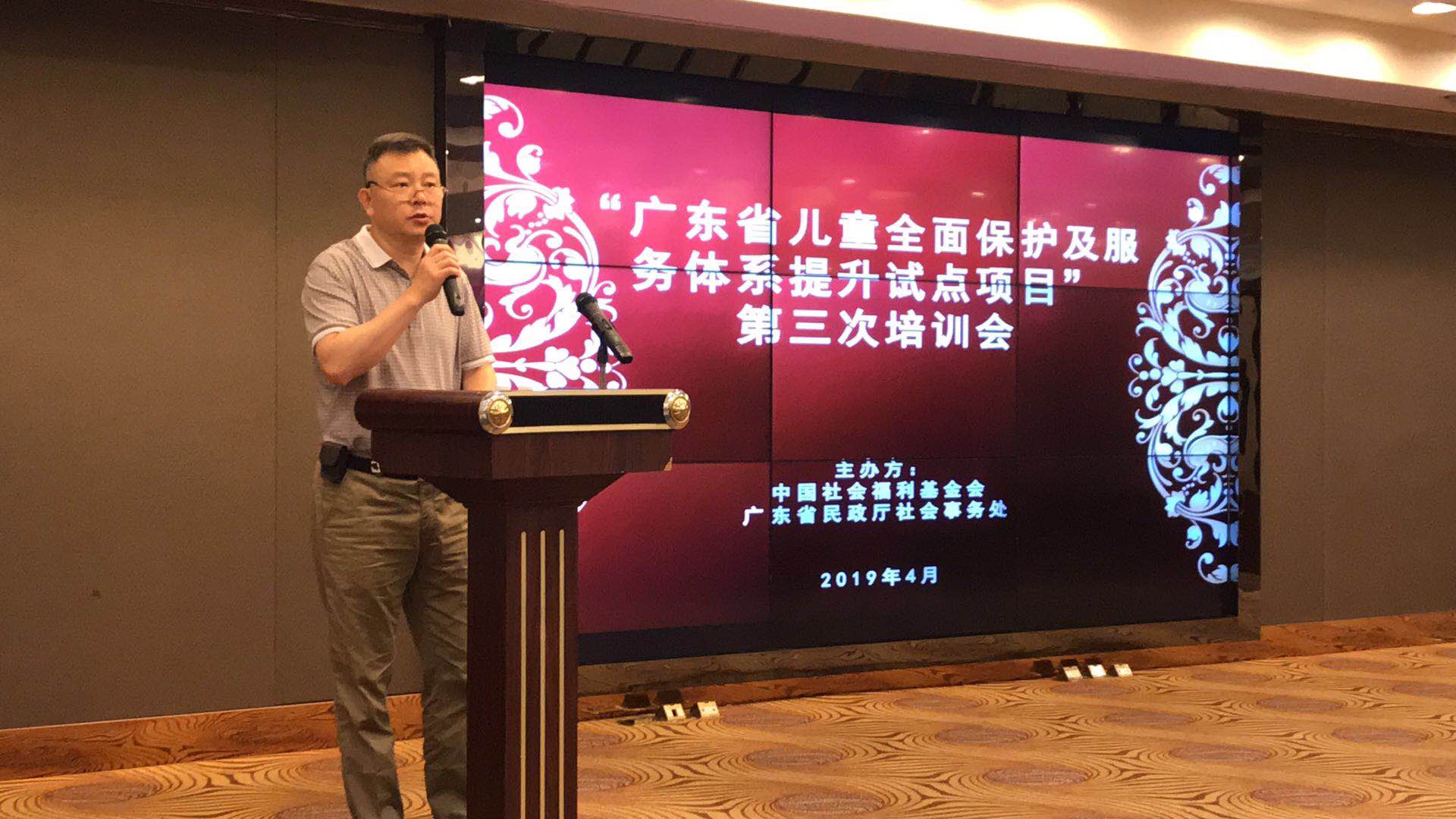 49-11广东省儿童全面保护及服务体系提升试点项目(以下简称广东惠童项目一期)第三次培训会,在广东省佛山市三水区恒福星际酒店顺利召开。本次培训会由中国社会福利金会和广东省民政厅社会事务处主办广东省公安厅人民检察院未检处妇女联合会残疾人联合会中国社会科学院大学社会工作学院受邀授课,广东省21个地区民政部门相关同志参加会议。省民政厅副调研员陈爱兵主持会议。