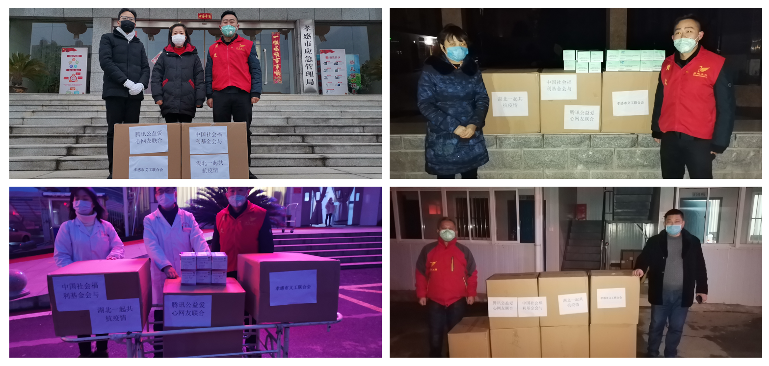 在紧急的物资调配与沟通联络下,截至2020年1月26日23时,第一批防疫物资共计45000只医用口罩已经发送至湖北省孝感市的4家单位,分别为: