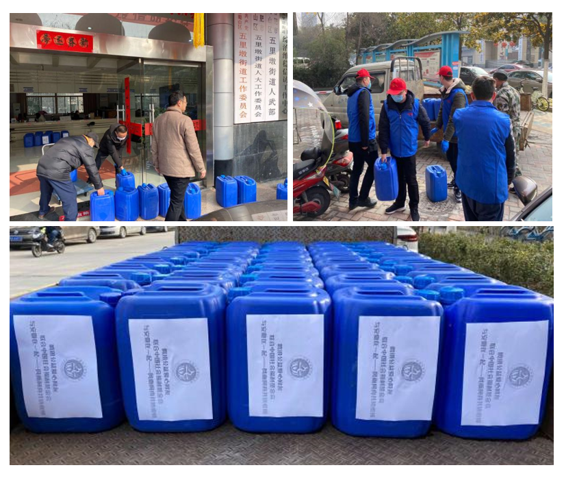 (2)安徽省伙伴机构-安徽省广善公益助困服务中心联合合肥市善水环境保护发展中心发放2吨84消毒水,其中1吨用于五里墩街道及下属六个社区卫生防疫,1吨捐赠合肥市民政下属合肥市殡仪馆用于卫生防疫工作。另外发放2件酒精共计480瓶(100ml/瓶)于五里墩街道办事处用于卫生消毒。