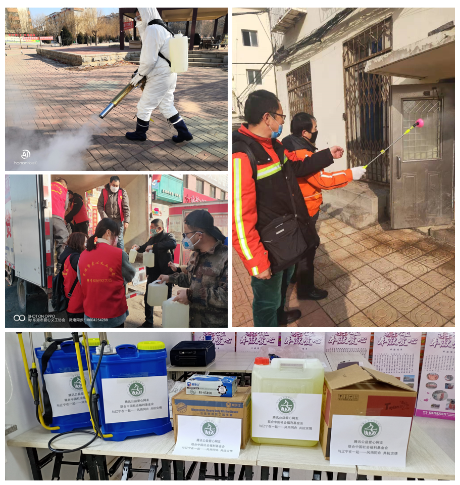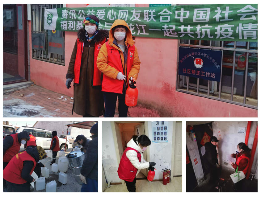 (9)黑龙江省伙伴机构-哈尔滨市松北区阳光社会工作服务中心在中国社会福利基金会的支持下,联合省内多家社会组织在哈尔滨市、海林市等,采购400斤酒精,并进入多个社区,联合社区工作人员及30余名志愿者,在社区办公室、宾馆、超市以及50多个社区楼道进行消杀防疫工作,入户500以上的家庭进行宣传,惠及1000多社区居民。