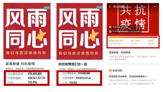 2020年1月26日凌晨,中国社会福利基金在腾讯公益平台发起“紧急救援,共抗疫情”项目,此后,中国社会福利基金会芒果V基金、灯塔行动项目、授渔基金,也积极动员社会力量,在腾讯公益和支付宝公益开通募捐项目。截至2020年1月31日,募集善款总额55,569,961.34元,项目支出总额30,759,204.70元,参与募捐的爱心人士近100万人次。