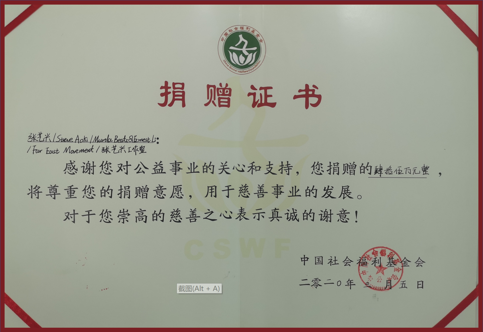 中国社会福利基金会感谢张艺兴先生和他的团队以及时刻关注国内疫情,并奉献自己一份力量的Steve Aoki,Murda Beatz,Far East Movement几位艺人的爱与心意。他们用实际行动诠释了爱无国界的公益理念。