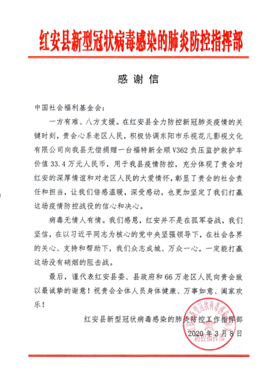 中国社会福利基金会小葵花儿童安全用药公益基金联合爱心企业浙江东阳市乐视花儿影视有限公司为黄冈市红安县中医医院捐赠一台福特负压救护车,为此红安县新型冠状病毒感染的肺炎防控工作指挥部为中国社会福利基金会发来感谢信。