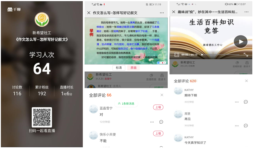 3月14至17日,山东省伙伴机构-青岛市新希望社会工作服务中心针对青岛市困境儿童及其家庭开展资源共享、康复服务、心理服务、课业辅导、打卡阅读、小小演说家、线上好声音等服务,共服务青岛市困境儿童837人次。其中,进行了3次线上课业辅导直播课程活动,分别为“怎样写好记叙文”,“疫情防护知识竞答”和“生活百科知识竞答”,共计直播课程参与人员达到155人次。