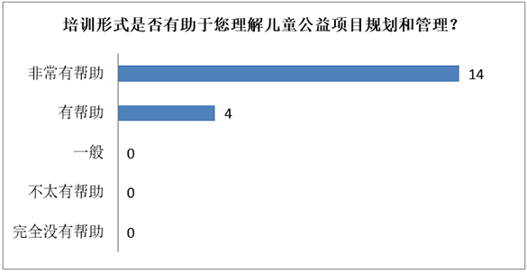 培训后,基金会针对此次儿童项目管理培训学员进行了问卷调查,大家对培训内容满意度高,对培训形式的实用性有很高的评价。学员们普遍反映此次培训课程对项目规划有非常大的帮助,了解了目标人群参与的重要性,在今后的工作中以儿童的角度设计项目,并结合儿童利益最大化原则开展工作。