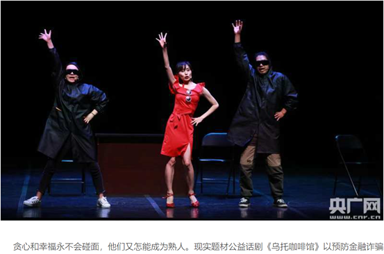 2015年—2016年,为提高老年人的金融素养、防范金融欺诈能力、丰富老年人社区文化生活,中心在北京市民政局指导下开展了“北京老年人金融话剧社区行”项目,将老年人感兴趣的金融话题、社会热点金融案例编写成话剧剧本,深入社区演出,寓教于乐,在北京东城龙潭街道、海淀八里庄街道、西城月坛街道等100余个社区为老年人普及金融知识,受到社区和居民的欢迎和肯定。