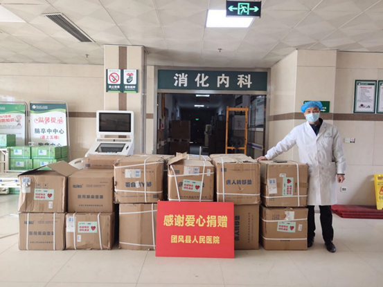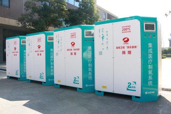 由于新冠肺炎病人肺部被感染、呼吸困难,需要输氧维持,“快乐家族”五位主持人通过芒果V基金捐款100万元,为湖北黄冈一线防疫医院捐赠了4套制氧设备;