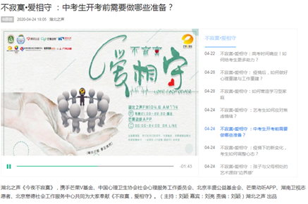 后疫情时代,为了帮助一线防疫人员和湖北人民坚定信心、舒缓压力、处理恐慌等负面情绪,芒果V基金联合湖北人民广播电台开办了“爱·相守”心理咨询节目,通过心理专家直播节目、线上咨询等方式给予大众心理支持。