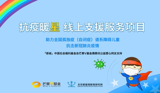 芒果V基金根据总书记《在统筹推进新冠肺炎疫情防控和经济社会发展工作部署会议上的讲话》的相关要求,面向残障、自闭症青少年群体开展长效的援助服务,开展抗疫暖“星”——全国自闭症家庭抗击新冠肺炎支持项目。服务因疫情只能待在家里,不能外出,更不能去专业机构进行康复训练的自闭症青少年。随着家长们的复工,自闭症患儿及其家庭面临着重重困难,基金与专业服务机构合作,对这一人群开展专业支持和服务。目前“抗疫暖星”线上直播课程开播23讲,已有超过10万人次通过线上直播课程进行了学习。