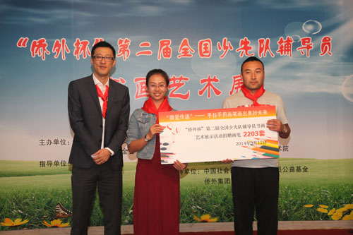 2014年9月12日上午10点,由中国少先队事业发展中心与中国社会福利基金会联合举办的“‘侨外杯’第二届全国少先队辅导员书画艺术展示活动”在北京市东城区少年宫隆重举行.来自内蒙古、云南、山西、四川、广东、北京等地的辅导员代表、知名书画艺术专家和社会爱心人士参加了活动。中国社会福利基金会副理事长兼秘书长缪力、中国少先队事业发展中心副主任王溪、全国政协委员、中国书法家协会分党组书记、驻会副主席赵长青等有关领导出席了开幕式。