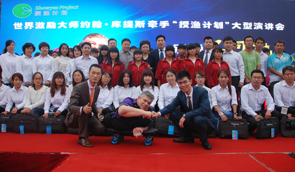 9月22日下午,世界激励大师——约翰·库提斯为在涿州职教中心接受“授渔计划”教育救助的贫困学生,带来了一场主题为“别说不可能”的公益演讲。云南昭通地震灾区58名受灾学生,西藏、甘肃、青海等14个地区的800多名贫困学子以及涿州职教中心3600余名师生,与他面对面感受生命奇迹,聆听励志故事。此次演讲活动由中国社会福利基金会、新华网和涿州市政府主办,中国社会福利基金会授渔基金、公益帮扶基金、善举基金、涿州职教中心、顺道天下、中育教育集团联合承办,由名城恒盛投资控股集团独家赞助。