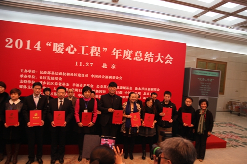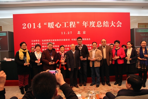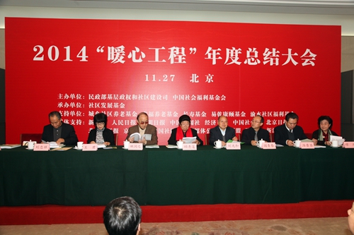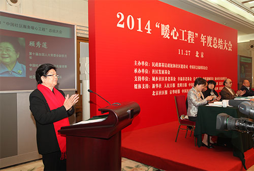 中国社会福利基金会“暖心工程社区服务站”年度总结大会于2014年11月27日 上午在人民大会堂重庆厅顺利召开。第十届全国人大常委会副委员长顾秀莲,中国社会福利基金会理事长刘光和,原国家出入境检验检疫局局长兼海关总署副署长田润之,原国务院外事办公室副主任原焘,民政部民间组织管理局副局长刘忠祥,民政部基层政权和社区建设司副司长汤晋苏,中共中央党校智慧养老课题组组长王君,全国老龄工作委员会办公室副主任阎青春,中国社会福利基金会副理事长兼秘书长缪力、副秘书长、救急难项目部主任缪瑞兰以及全国14个省市暖心工程社区服务站的执行单位、爱心企业,专家学者等200余人参加了会议。