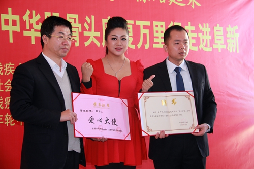 (左:阜新市残联理事长赵作奎,中:爱心大使王可儿,右:博爱基金秘书长郑大贵)