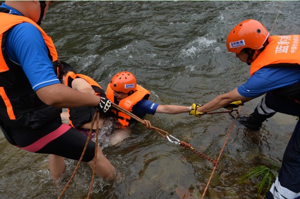 (图9 救援中遭遇悬崖,队员架设绳索准备强行推进搜救工作)