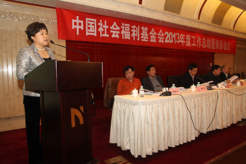 2014年3月13日,中国社会福利基金会2013年度工作总结暨表彰会议在京召开。基金会顾问、理事长、副理事长(秘书长),各理事、监事,基金会副秘书长,基金会各部门主任、副主任,各分支机构、专项基金、公益项目管委会执行主任(或秘书长)和财务人员140多人出席会议,基金会各部门工作人员列席会议。民间组织管理局副局长贾晓九应邀参加会议。