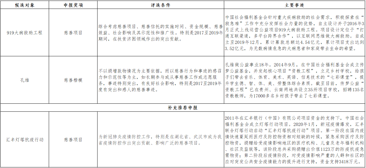 按照“民函〔2019〕91号民政部关于开展第十一届‘中华慈善奖’评选表彰活动的通知”和“民函〔2020〕39号民政部关于调整第十一届‘中华慈善奖’有关安排的通知”,经组织推荐、理事长办公会认真研究,拟申报“919大病救助工程”作为“慈善项目”类候选项目;公益明星“孔维”作为“慈善楷模”类候选楷模;“汇丰灯塔抗疫行动”作为在抗击新冠疫情中有突出表现的“慈善项目”类补充申报候选项目。现予以公示。公示期为2020年6月1日至6月5日,共5个工作日。公示期间,如有异议,请以来信、来电等形式进行问题反映。